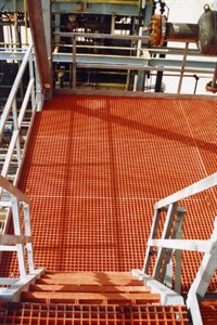 Fibergrate worked with PPG to analyze existing corrosive environments to determine the right solution for their needs. Vi-Corr® vinyl ester molded grating was chosen for its high corrosion resistance and ease of cutting. Fibergrate’s fabrication services were utilized to cut approximately 3,000 square feet of 1-1/2” deep, 1-1/2” square mesh grating for walkways and platforms around the processing area.
